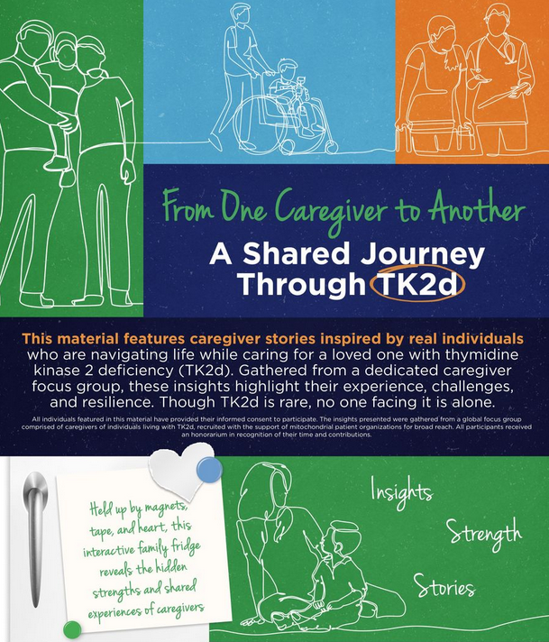 This caregiver guide shares real-life stories and reflections from those caring for people with TK2 deficiency. It offers emotional support, tips for daily care, information about treatment options, helpful resources, and encouragement for caregivers navigating this rare disease alongside their loved ones.
